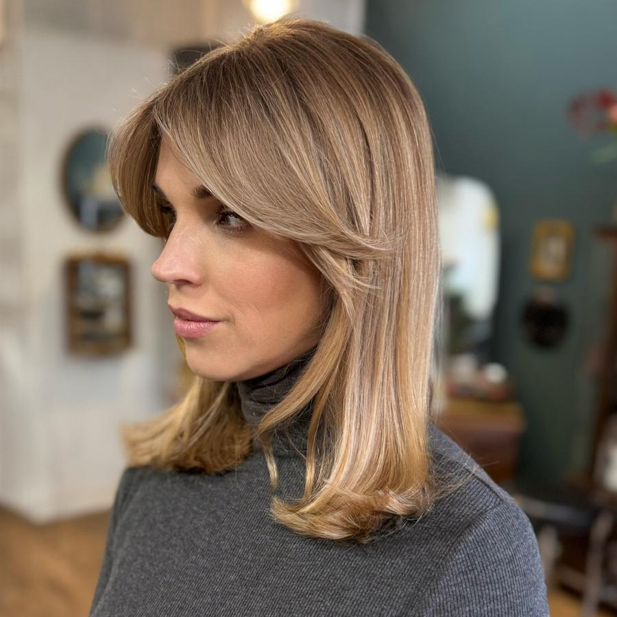 Perfekte Proportionen für mittellanges Haar inklusive Blowout‑Finish – weich, voluminös und elegant in Form gebracht.